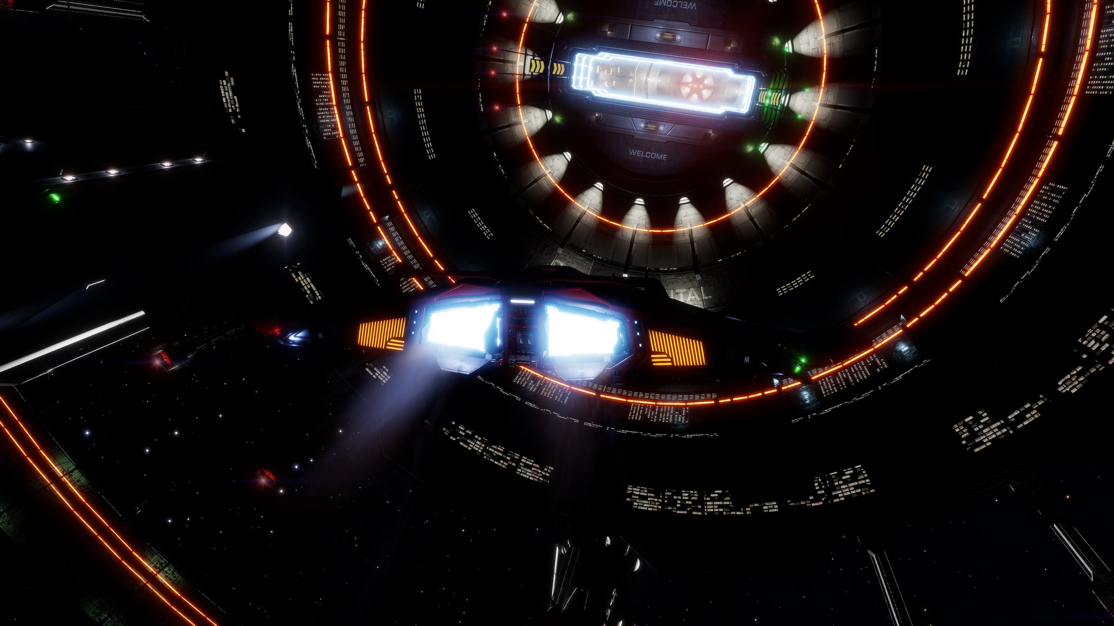 I ask permission to dock, and am given landing pad 2. I know the one directly in front of me is the single medium pad, but I want one of the small ones. Where are they? And which one is landing pad 2? After what seems lake an age, but is probably about thirty seconds or so, poking around nooks and crannies of the station, I find landing pad 2, but it’s in a really awkward place, the wrong way around and it seems it needs to be approached though a wall. I try one of those “fly in, flip around and land” manoeuvres and find myself belly flopping on the wall.