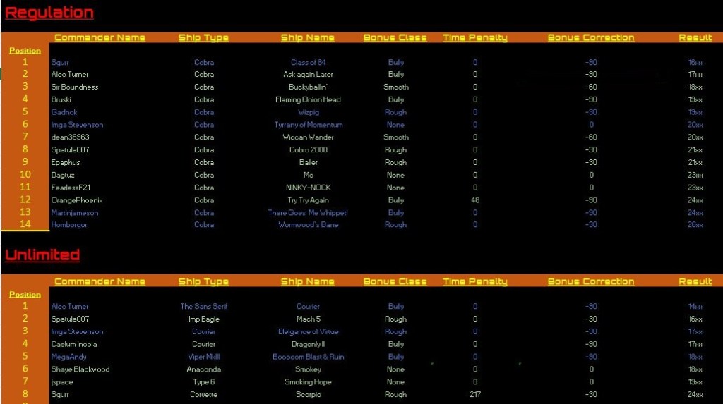 Again, this is a version of one of the earliest races. You have to fly fast, with no shields, a paper thin hull, no refuelling (or even scooping), no repairs, no automated docking or cruising. Just in and out of spaceports buying and selling. Profit is must. Loss means disqualification. You even get bonus points for having virtually no hull left. Slow and sure comes last in the race.