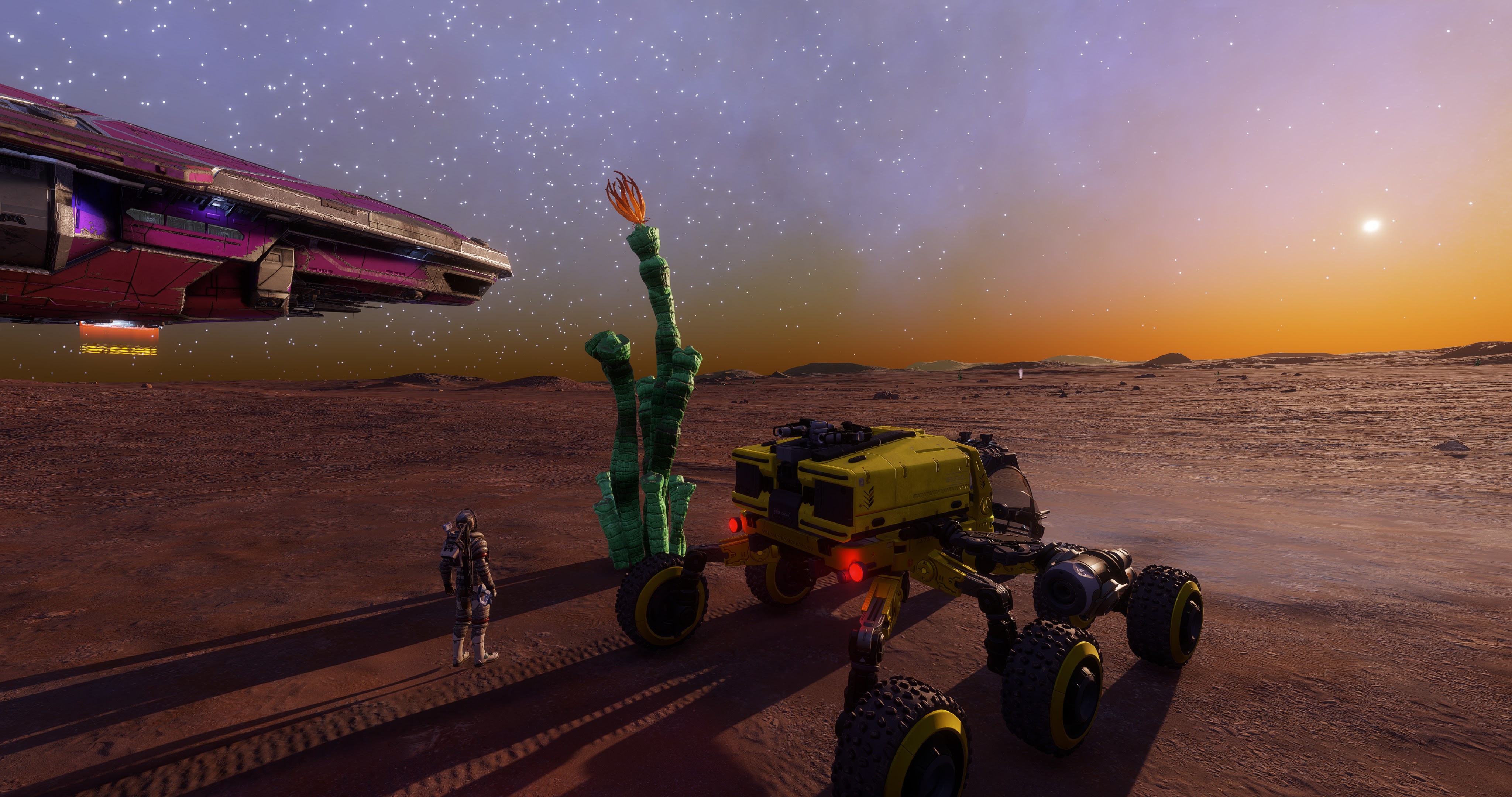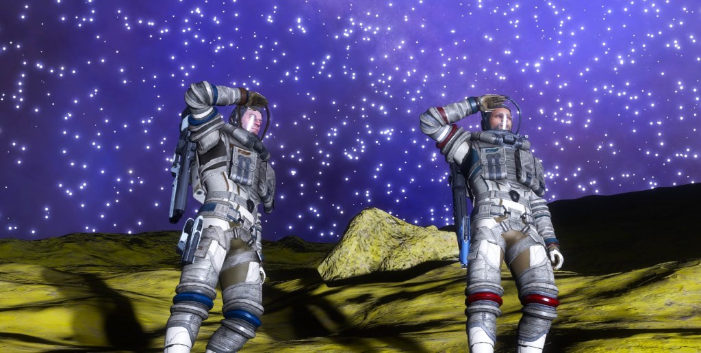 We parked up and gazed at the night sky from the ridge, continuing our chat from the valley. We discussed about all sorts of things, how long we had had our Pilot’s Federation licenses, near misses, landing on high G worlds, the commanders who come out every few months to resupply and repair the Hermes and some of the amazing things he’d seen on his ridiculously long journey out in the black. I also asked him if there was anything he wanted to see but hadn’t seen yet. His reply surprised me. A ringed Earth-like world. He had never discovered one of those yet. Even after two thousand days!