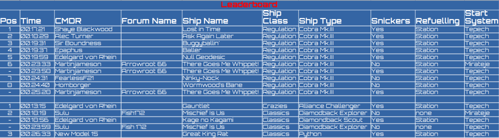 And there I am! The final leaderboard and a minute and a half improvement. And nowhere near in last place either! A great bundle of thanks, and snickers, to Ashnak who has worked hard to sponsor and adjudicate the race. It’s a lot of work sifting through all that evidence, forms and creating those leaderboards. Without sponsors like him we would not have these wonderful races.