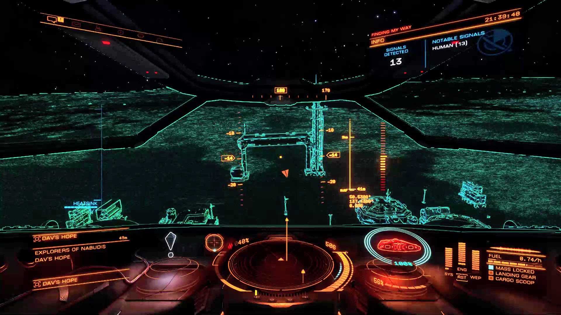 I was heating up beyond 200% and the hull was falling apart, yet still I plouged ahead, scooping while the FSD charged until it was time to turn toward the target system and jump. I arrived at Hyades Sector DR-V C2 – 23, the heatsink finally deployed, and I was cool again! Landed fine at the abandoned mining settlement, took off and backed up to just over 300m to make my approach for the Limbo, I accellerated to 500 m/s throwing my little ship toward the gantry and hit the crossbar full on once more. Somehow, it only minimally damaged the shields and I backed up for another go.