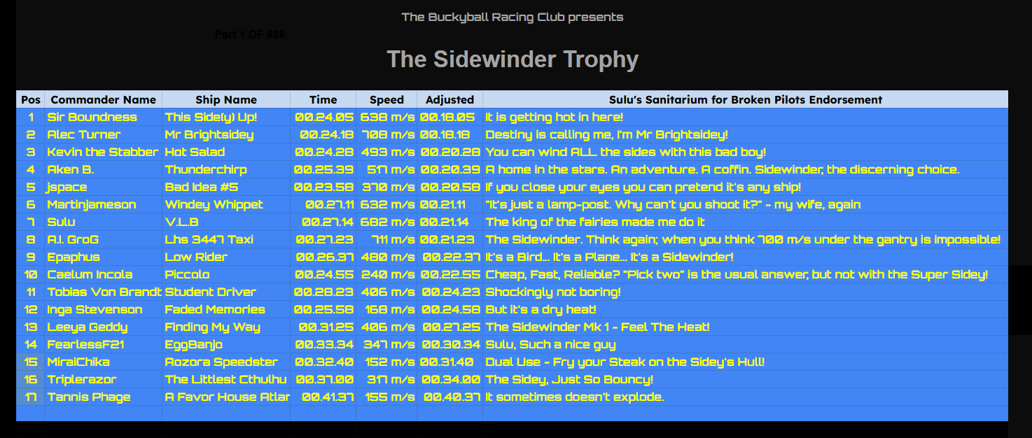 The first race, once again hosted by Sulu promised to be a nice simple introduction back into Buckyball. Although, as you have probably gathered, with the unlimited class restricted to just one ship – the plucky little punches-far-above-its-weight Sidewinder Mk I. Now, the Regulation Cobra is a fun old ship, but as my time in game has been a lot less than it has been in recent years, and owing to my complete lack of skill in piloting My Favorite Headache last season I thought I would stick to unlimited this time. I hoped I would make a lot more progress if I just concentrated on one ship for each race, and one I know I’ll have a lot of fun flying. As I have said, I already have engineered one of the RushFleet’s ships specifically for Buckyball but I had also partly engineered the sidewinder too, and so, a love affair with the Finding My Way began to spout!