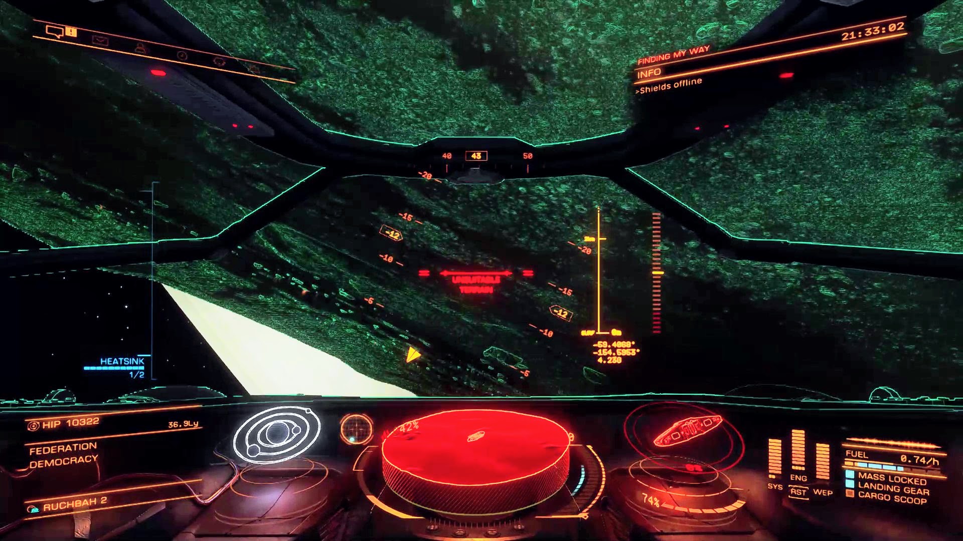 The pass through the tunnel couldn’t have gone much better and I broke through to orbital flight over Ruchbah 2 in record time, although I hit the ground so hard and with a bit of forward momentum that I flipped. Took a while to reset and land properly and it was time for Dav’s hope. On the way I overheated drastically on the second scoop -jump as the key I had assigned to the heatsink just wouldn’t work!
