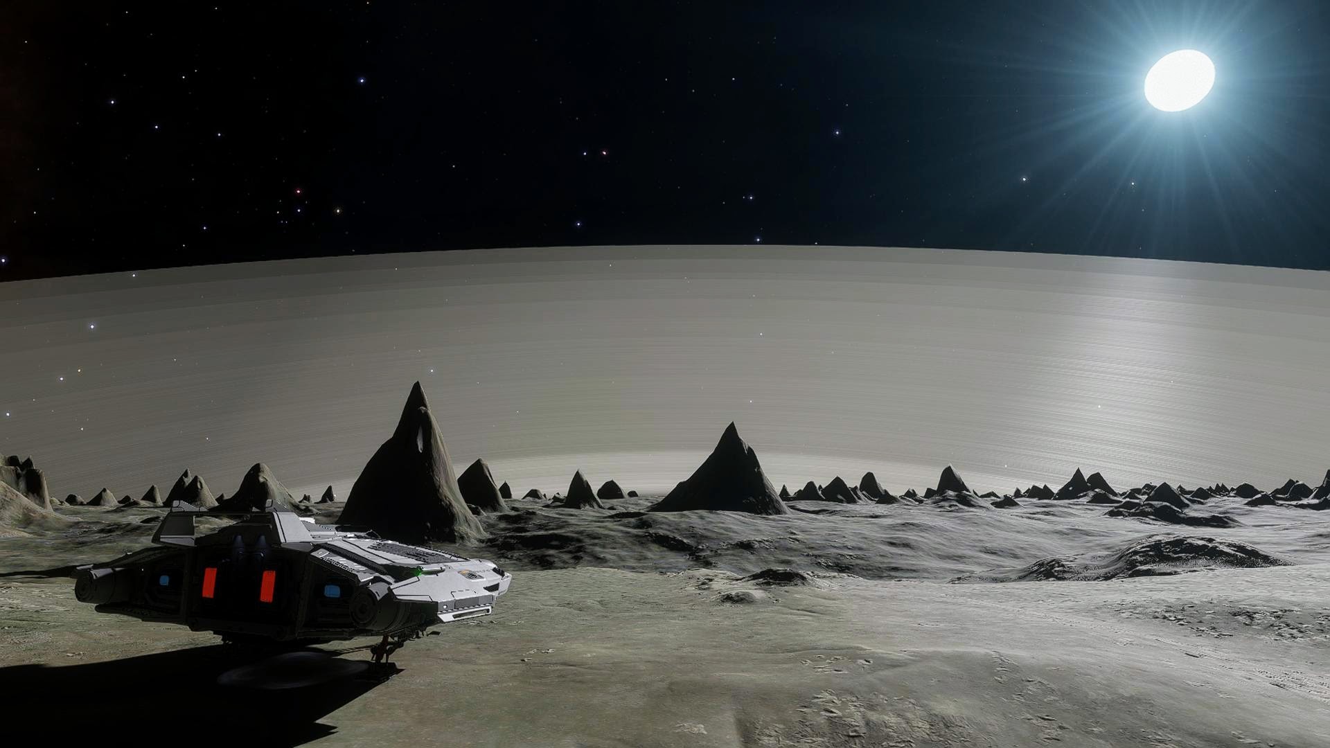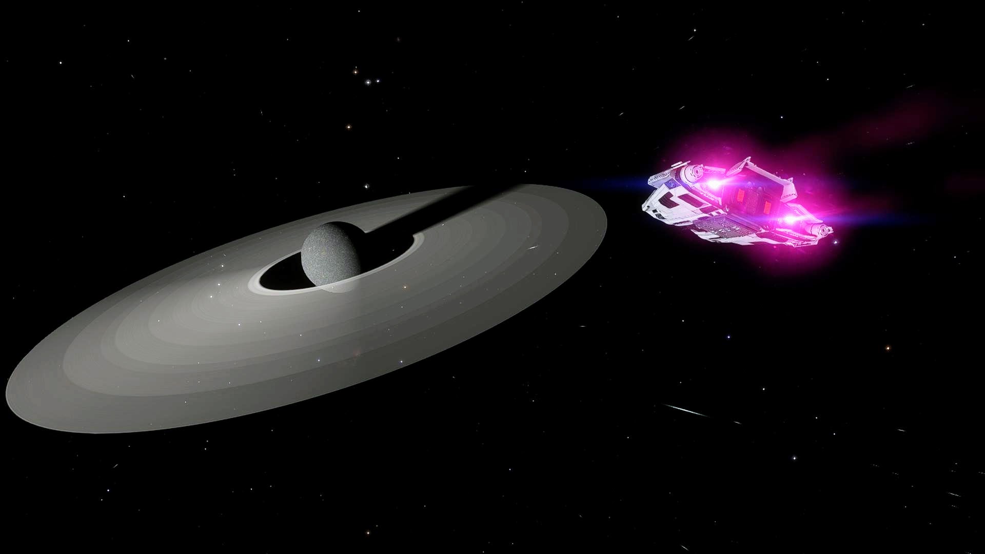 Next shenannigan was proving to be tricky. Ruchbah 2 is a large, hot world with over 4g of gravity. Landing there wouldn’t normally be a problem but doing it fast would require practice…and a shield! So I was going to have to approch more slowly. The rings also play havoc with the gravity breaking approach but seeing as my gravity breaking skills are limited to orbiting bodies only at the moment this mattered little to me. What was concerning, however, was making sure to land on the correct side of the planet to avoid the next jump being obsured, which means plotting the route to the third shenanigan had to be done before you begin your approach so you can make sure the next jump is behind you before attempting a landing.