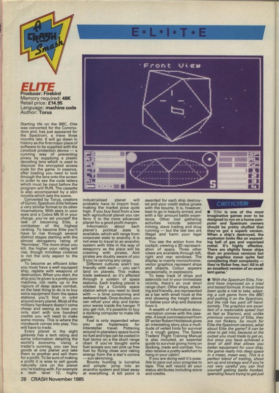 I fondly remember Crash Magazine. A monthly release that provided previews, reviews, hints, cheats, maps, readers letters all exclusively dedicated to the Spectrum. I would pick it up from WHSmiths or the village newsagent if they had one left and devour it greedily. The following year in October the November issue (#22) appeared on the shelves and one of the reviews was for the ZX Spectrum version of Elite!