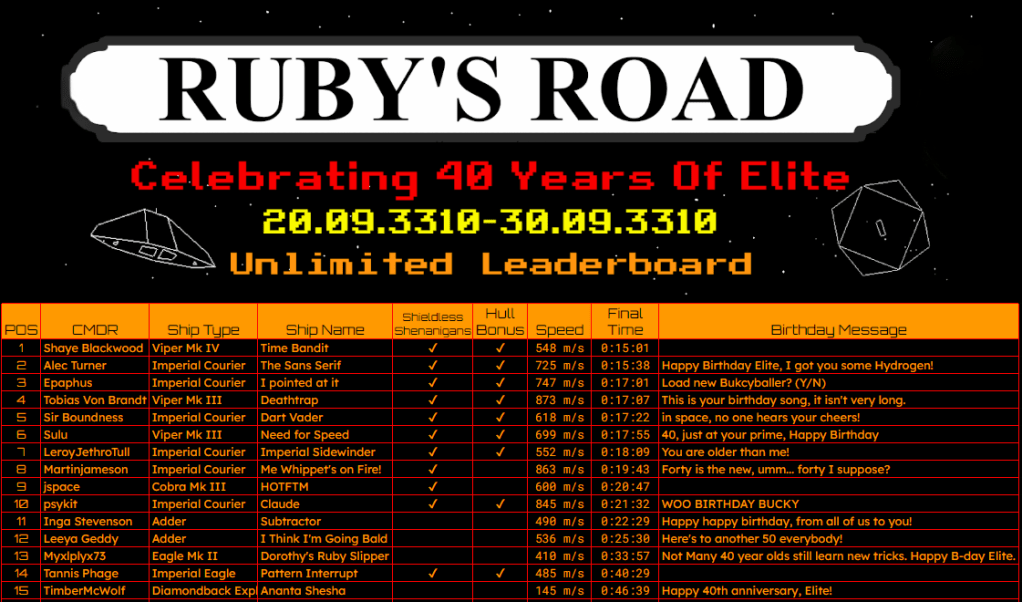 Forward thirty nine years. The Ruby Anniversary of the original release of Elite is upon us. Celebrations are to be had in it’s ancestor, Elite Dangerous. Many pilots would each be taking their Cobra Mk III to Lave Station for fun and shenanigans. It was rumoured there was to be a Thargoid attack on Shinrarta Dezhra, and there was going to be a Buckyball Race!