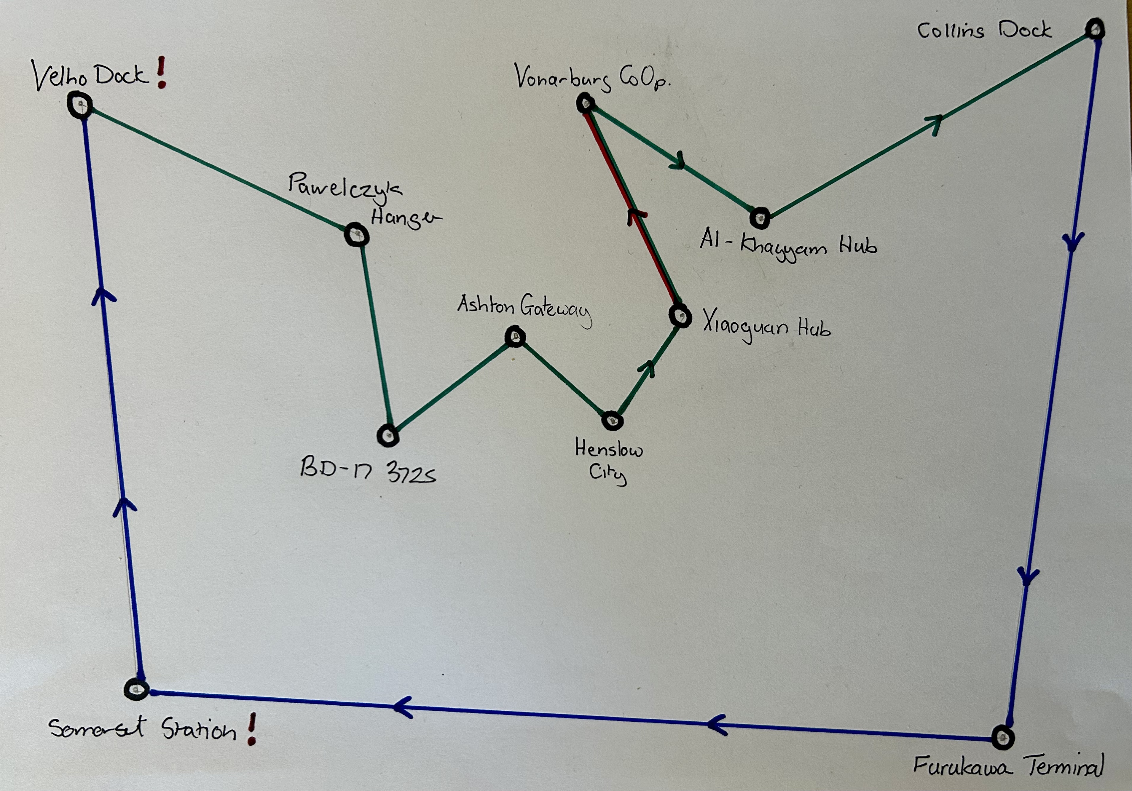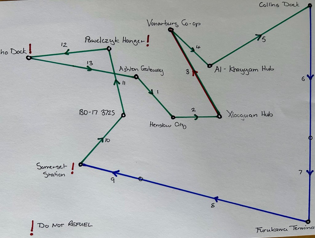 I redrew the diagram, placing exclamation marks where I must not refuel (you may notice them also in the original diagram – this is because I thought I might need less fuel for the last jump then, too. Turns out I didn’t).