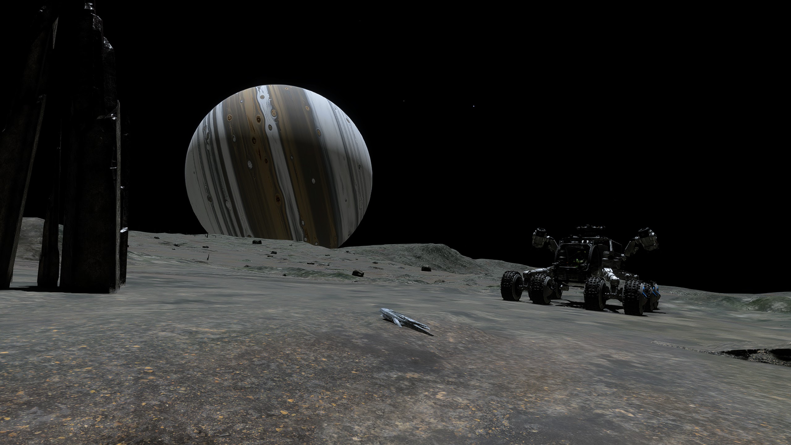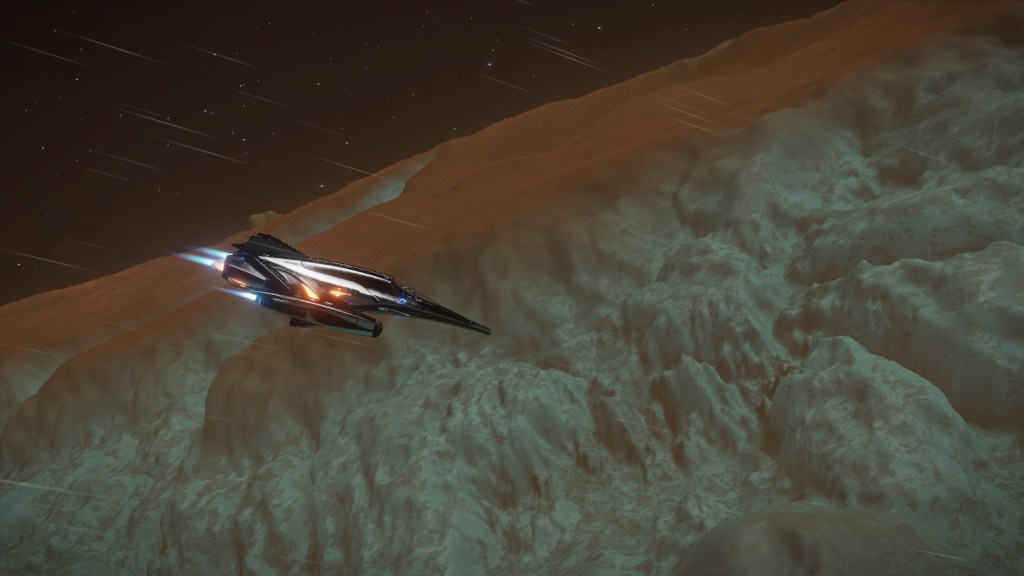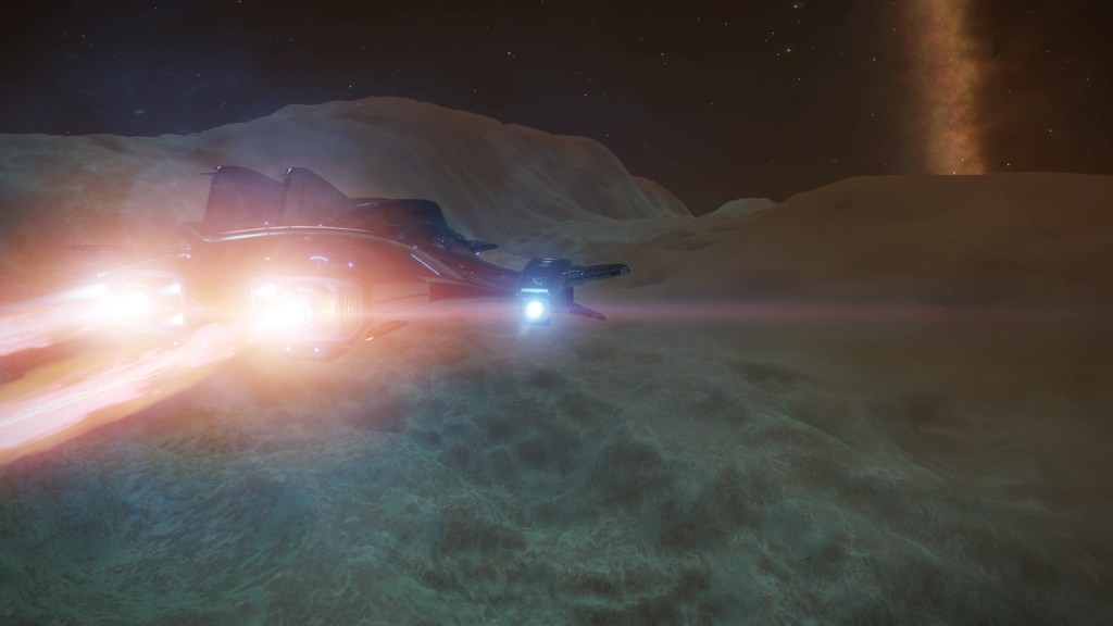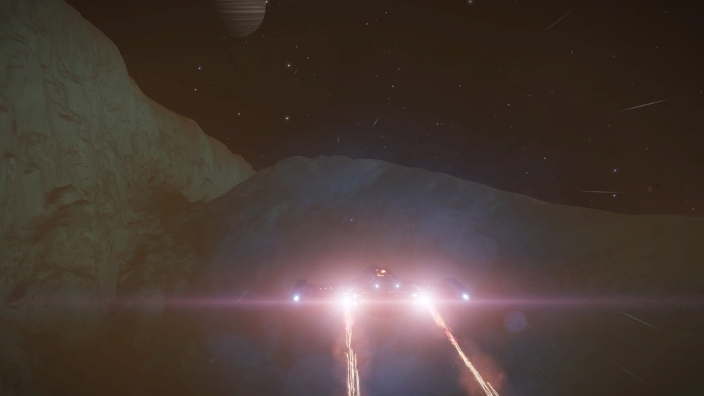 Sometimes there was nothing else for it but to send her away, and just look for these things from the ground in the Scarab. It isnt long before you’ll see some new outcrops in the distance, or maybe spot a small spinney of shards as you trundle over the summit of a hill, or spying a whole thicket of them as you carefully inch your way down the side of a huge crater. Before I knew it, I had collected enough polonium and it was time to move on to the next moon. But I couldn’t resist a little race as close as I dare to the surface in the Kid Gloves for a few minutes before hauling back on the yoke and blasting away into space. Then it’s merely a case of rinse, wash, repeat. The planets we visit are all quite varied – they’re not all silver and are never boring to just wander about on, marvelling at the sights of the parent gas giant or the beautiful reds of Barnard’s Loop in the sky. It’s just so lonely here, but in a really good way! It wasn’t long before I found a large clutch of shards and I thought it would be a good idea to see how easy it was to get the SRV stuck. A problem all too irritating back in Legacy.