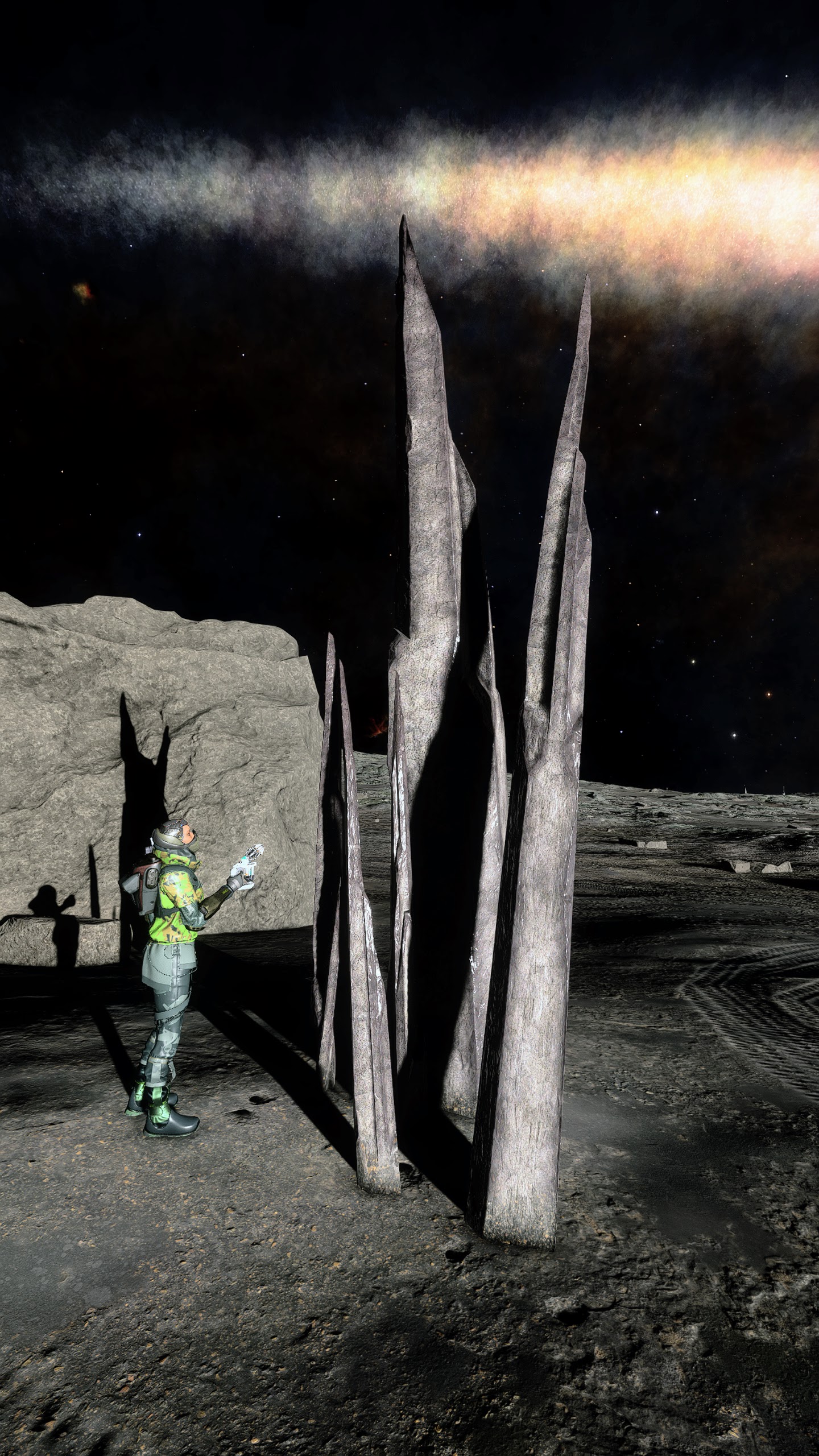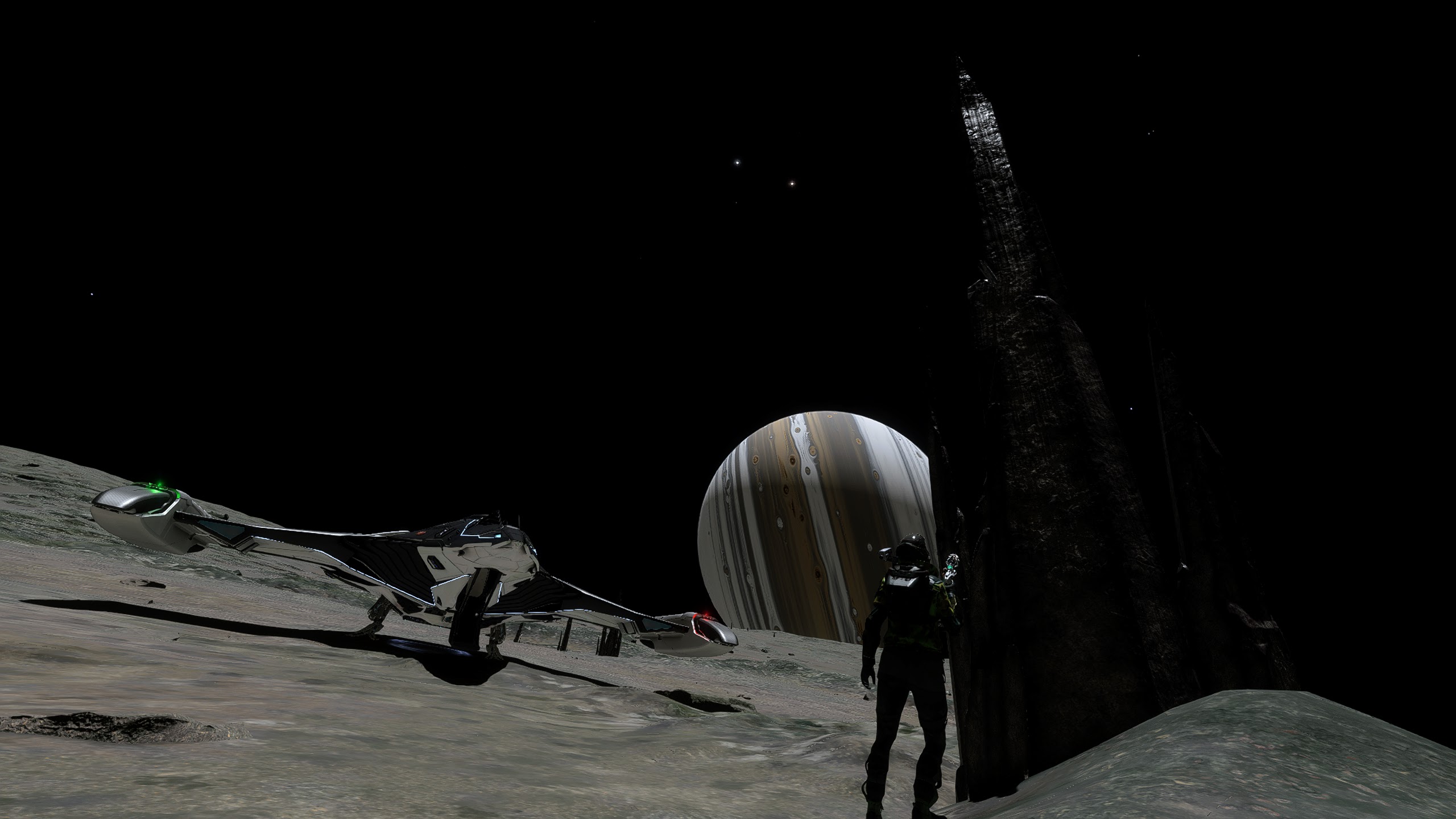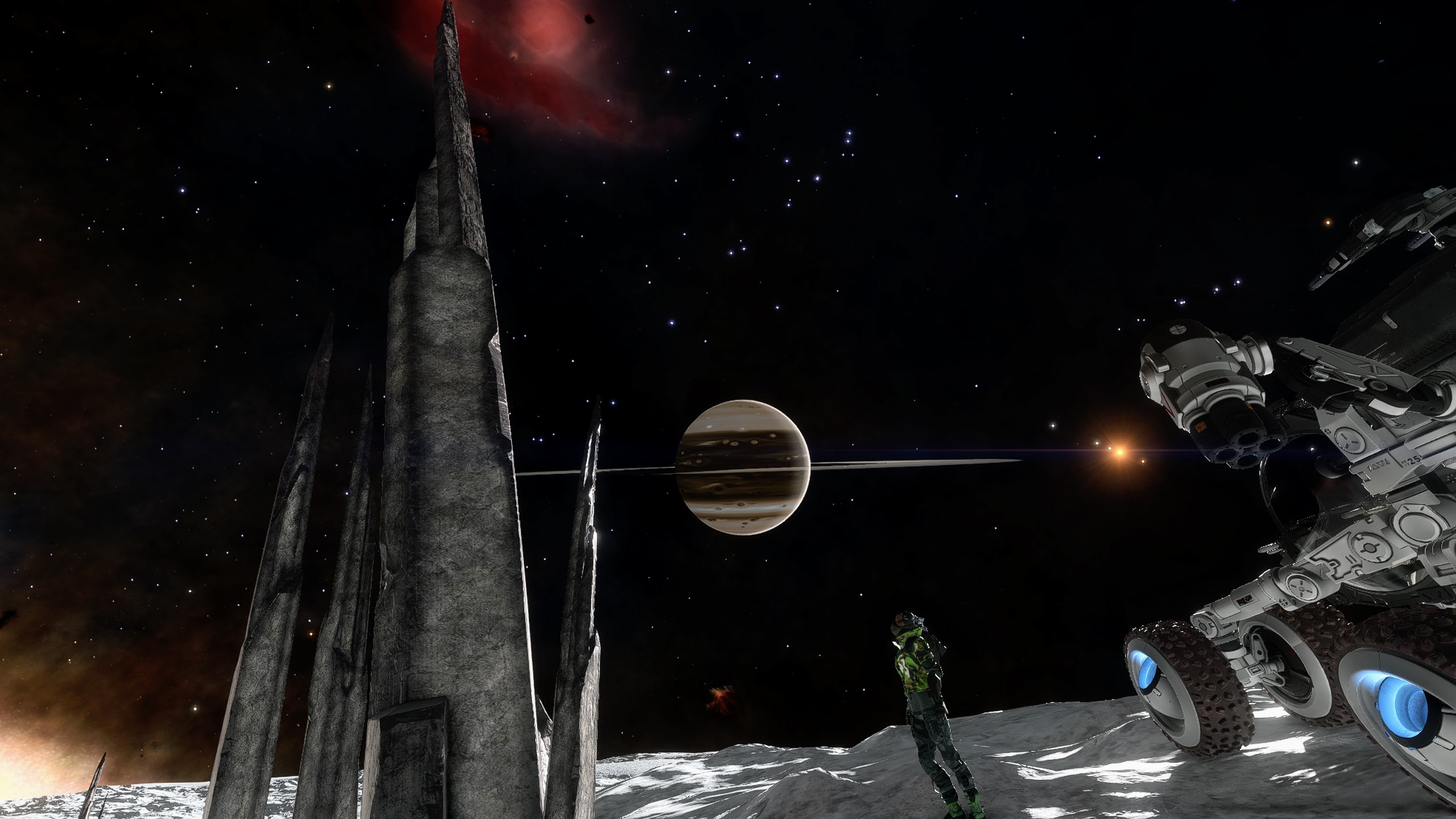 Sometimes there was nothing else for it but to send her away, and just look for these things from the ground in the Scarab. It isnt long before you’ll see some new outcrops in the distance, or maybe spot a small spinney of shards as you trundle over the summit of a hill, or spying a whole thicket of them as you carefully inch your way down the side of a huge crater. Before I knew it, I had collected enough polonium and it was time to move on to the next moon. But I couldn’t resist a little race as close as I dare to the surface in the Kid Gloves for a few minutes before hauling back on the yoke and blasting away into space. Then it’s merely a case of rinse, wash, repeat. The planets we visit are all quite varied – they’re not all silver and are never boring to just wander about on, marvelling at the sights of the parent gas giant or the beautiful reds of Barnard’s Loop in the sky. It’s just so lonely here, but in a really good way! It wasn’t long before I found a large clutch of shards and I thought it would be a good idea to see how easy it was to get the SRV stuck. A problem all too irritating back in Legacy.