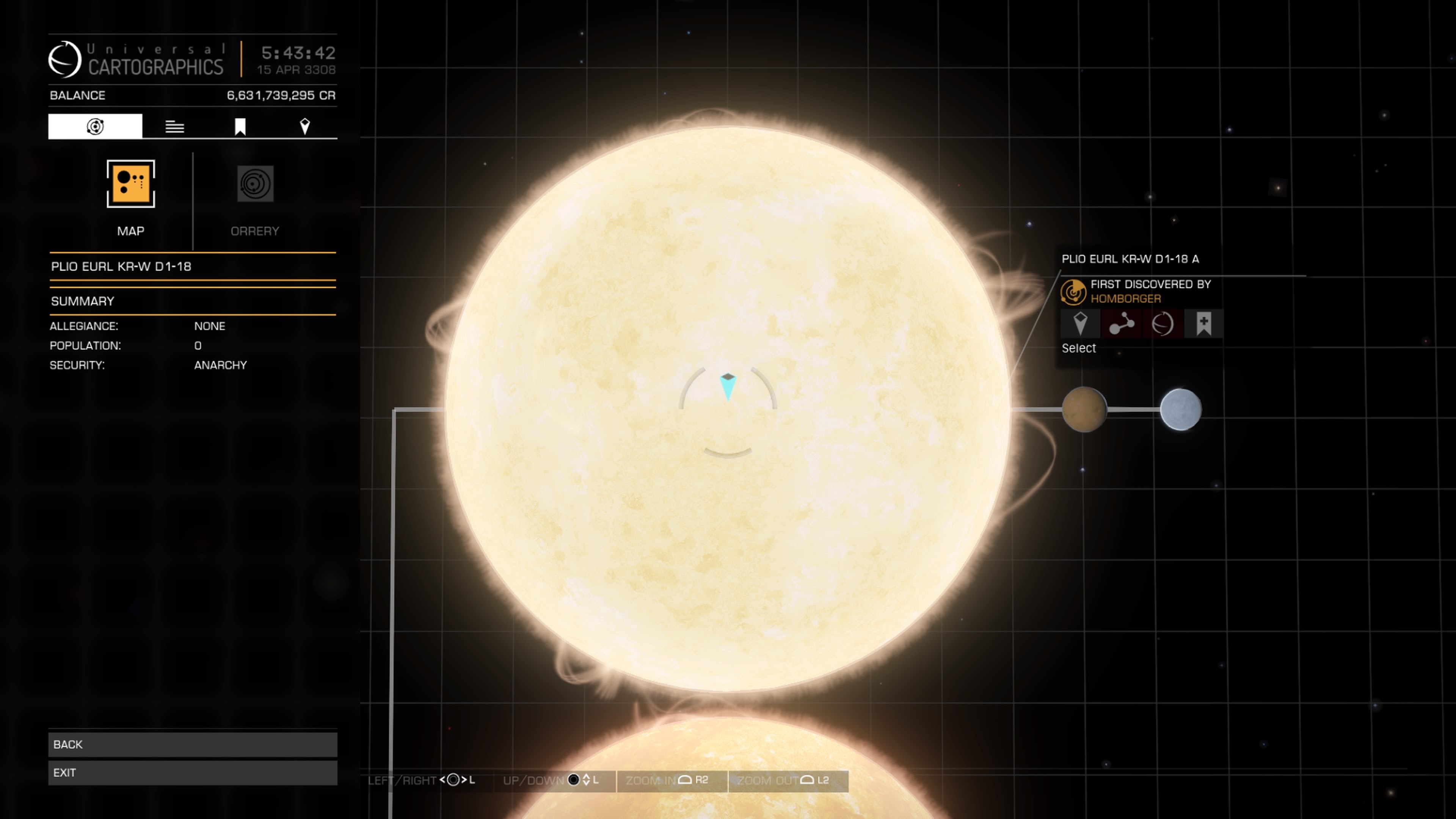 So, why PLIO EURL KR-W d1-18? Well, back when I first ventured out of the Bubble, on my PC account. I headed for the giant M class star VY Canis Majoris and I thought, why don’t I just fly up, as far as my ship can take me? I remember feeling a little disillusioned because every system on the way had already been discovered by someone else and I was desperate to discover one for myself. By now though I had completely given up on this and I just wanted to see what the starfield looked like the higher in the galaxy you got. So up I went. It must have been my fourth or fifth jump when I came across a lone star. I could tell it was a lone star because no planets were displaying in the scanner. I didn’t even honk the discovery scanner. I just scooped, flew around, lined up with the next system and charged the FSD. I then noticed one of the stars in the star field was moving. And brighter than the others. And it was I was just about to pass it. Intrigued, I headed towards it and found I could target it. The message came up soon after, “Discovered PLIO EURL KR-W d1-18a 1” It was a planet, and it just then popped up on the scanner. I brought up the system map and saw there were no names next to the system or the planet I had just found. I had just had my very first “First Discovered” system. I just sat there, staring, almost disbelieving. When I reported this back in the Bubble my name would be next to this system forever! It blew my mind. I welled up a little, it was kind of overwhelming. No other game can give you a feeling like this. I quickly honked and found that the system had several more bodies, which I then found on the FSS scanner. I even mapped them all too! Then I raced straight back to the Bubble to report it! That’s why we have come to this place first, it is a place that is very special to me.