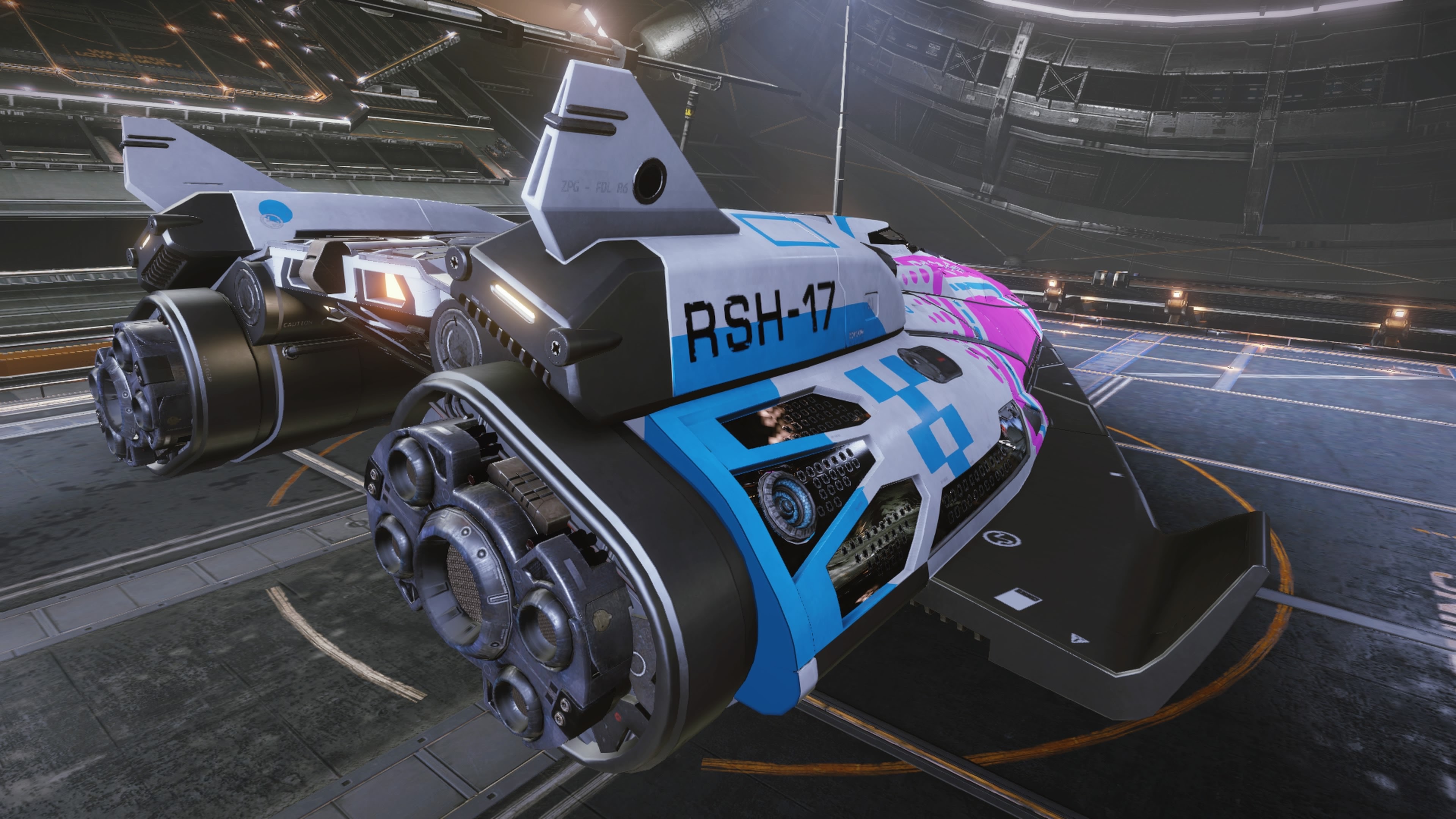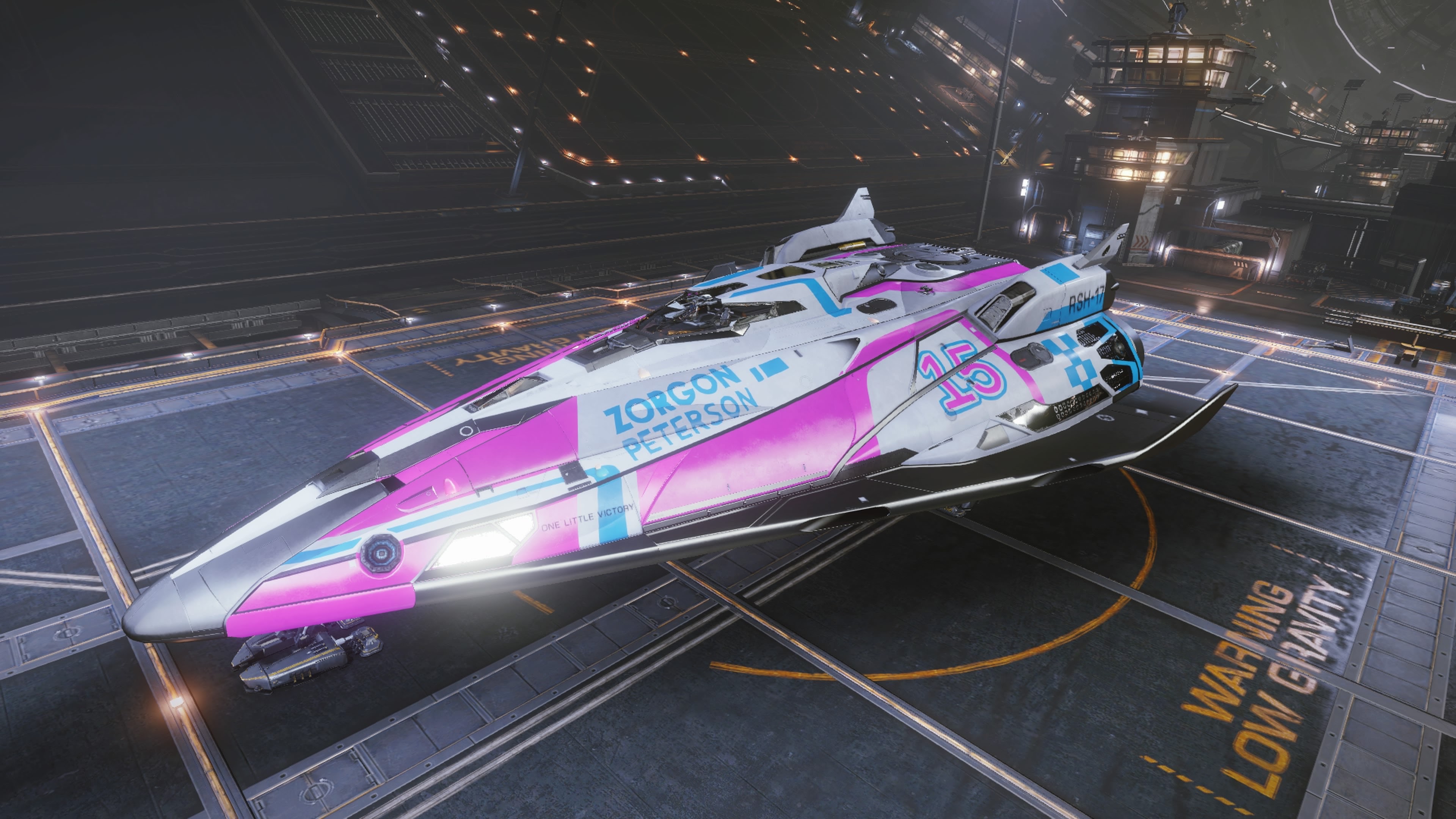 Ah! We finally come to the Fer De Lance. Built purely for combat it is a truly beautiful ship. I decided to give her a pink racing paint job and it suits her exceptionally well! It’s fast, highly maneuverable for it’s size, easily can go toe to toe with the smaller fighters and it packs some serious firepower.