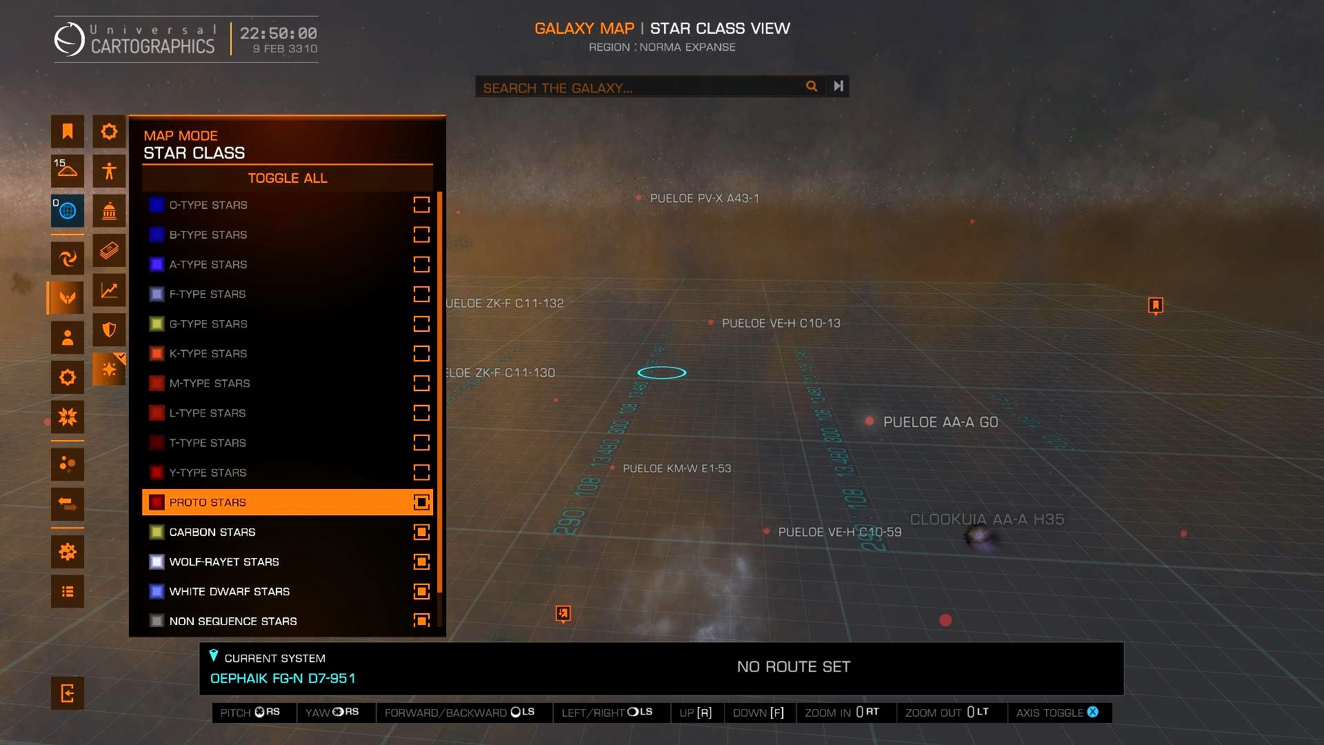 Lets take the very first system I “first discovered” – PLIO EURL KR-W d1-18. The “d” in the d1-18 on the end represents the mass of the system with “a” being a low mass system and “h” being a high mass system. Neutron stars tend to be at least a “d” mass whereas black holes tend to be at least “e” mass, “a” mass tend to be brown dwarfs, “b” mass red dwarfs and so on. I searched through the list of “h” mass systems, clicking on each one until I found something I had yet to see in Elite Dangerous. A wolf rayet star! It wasn’t too far either. Once I arrived there though, to my dissappointment, it was, of course, already discovered, but I seemed to have found a new way to search for interesting systems. Now, I have since discovered that most of those high mass systems are proto stars but a few of them are well worth visiting. With a bit of luck, no one else will have either!