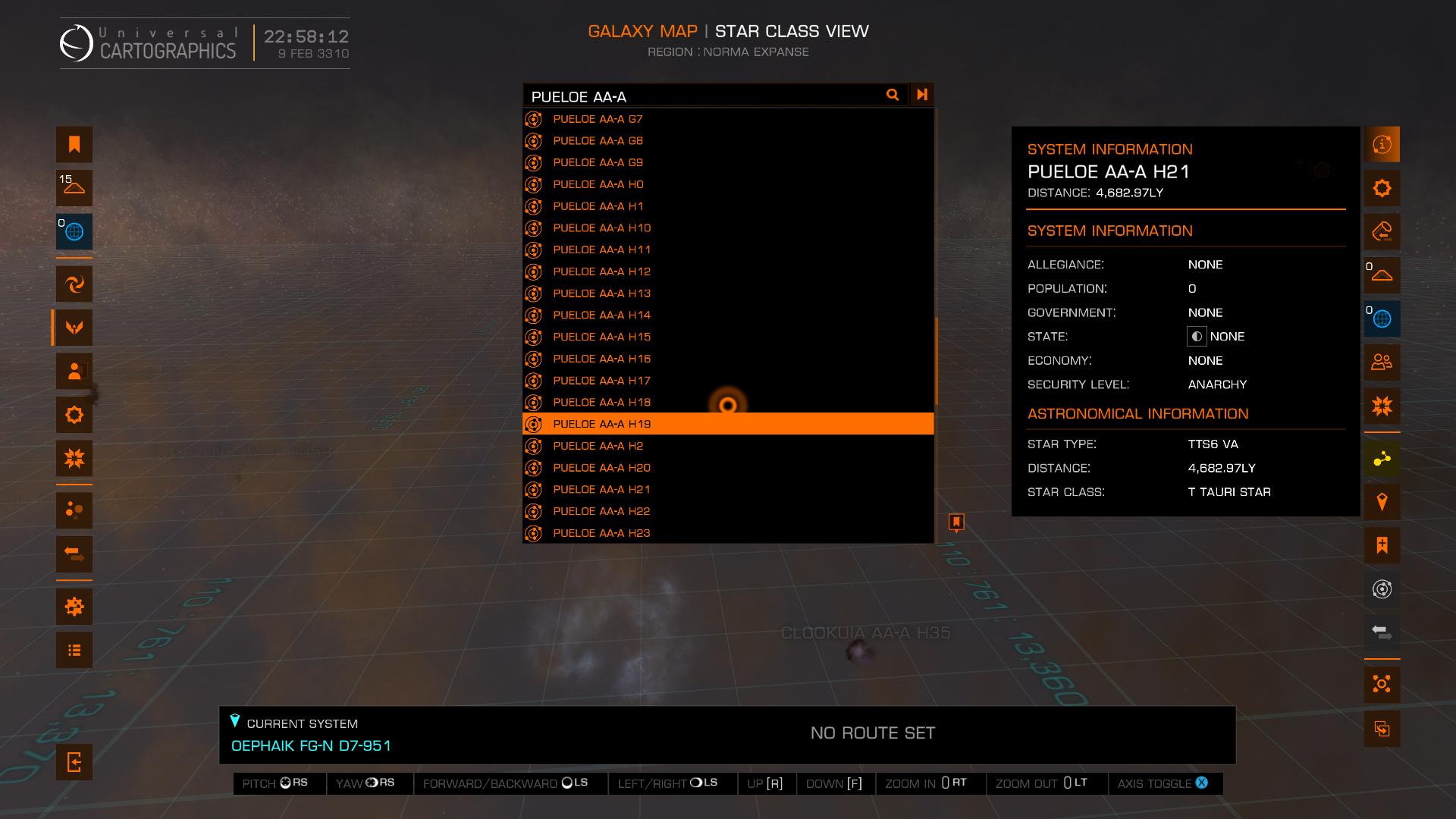 I thought maybe I had better fly upwards and downwards of the route the carrier was taking but I wasn’t sure what to aim for, or what to use as a lure rather than just blind jumping around. There was a nebula off in the distance but I was no longer keen. Nebulae are beautiful places to visit but almost eveyone makes a beeline for them and there isn’t all that much left to find unless you want to spend an awful lot of time in them. I like to keep on the move as much as possible. I don’t know why but I began to type in the title of the nebula on the GalMap. I began with the sector name and followed with the A-AA. Now most seasoned explorers already know this but when I did this a large list of heavy “h” mass sytems dropped down underneath the search box.